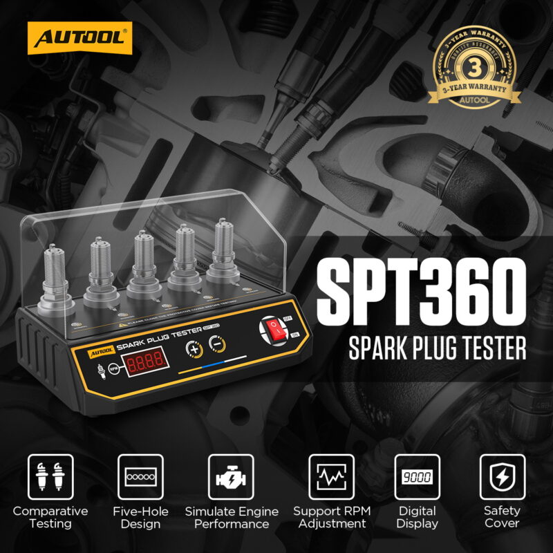 The AUTOOL SPT360 is a digital spark plug high-frequency tester with a maximum speed of 9000 rpm. It is compatible with all crankshaft engines and motorbikes and can test up to five spark plugs simultaneously.