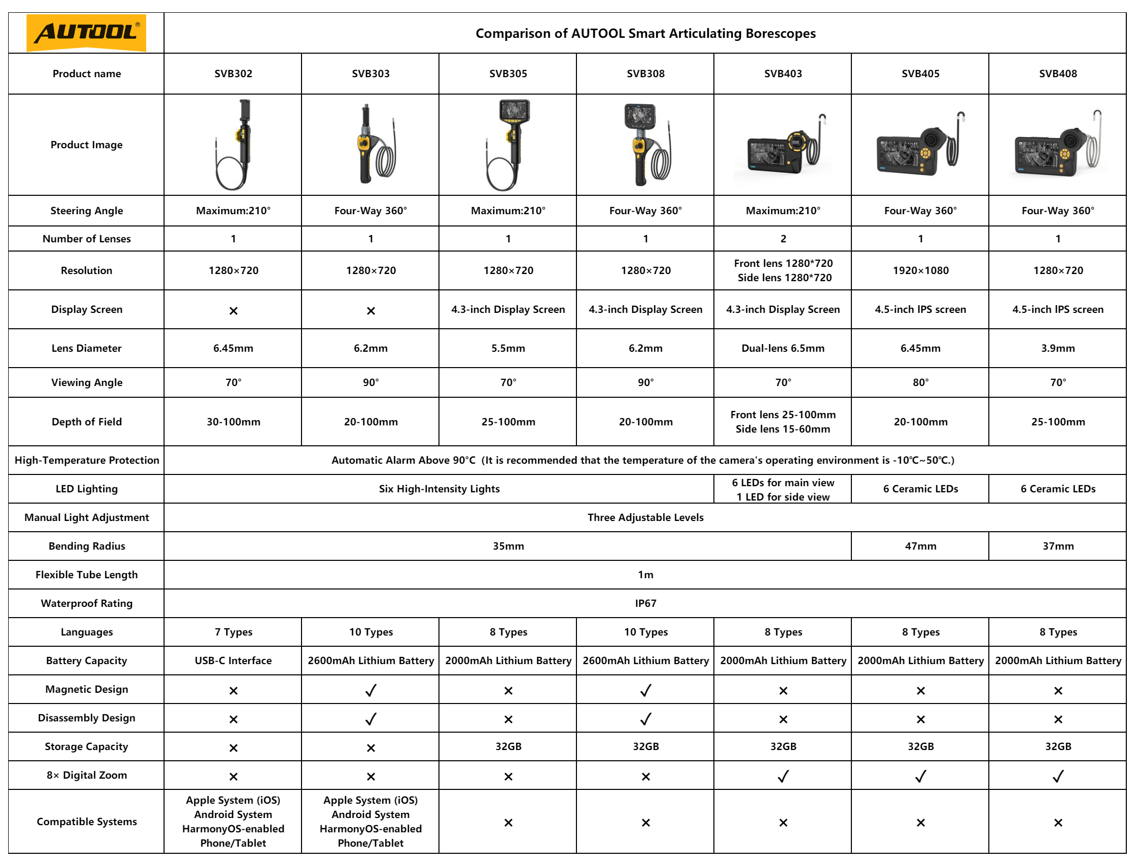 AUTOOL SVB302 Endoscope Camera features a bi-directional 180° rotating probe and a unique high temperature alarm function. This design allows users to easily insert the small probe into narrow spaces and transfer clear, vivid video and images to the cell phone screen via data cable to meet a variety of detection needs.