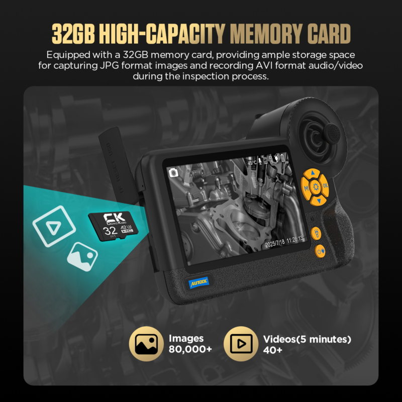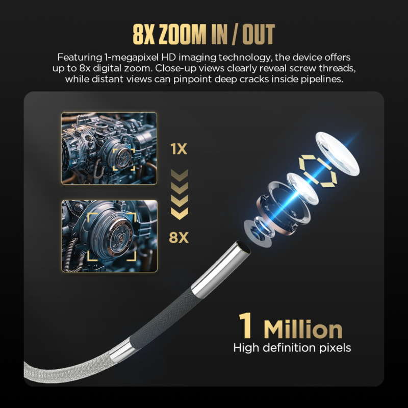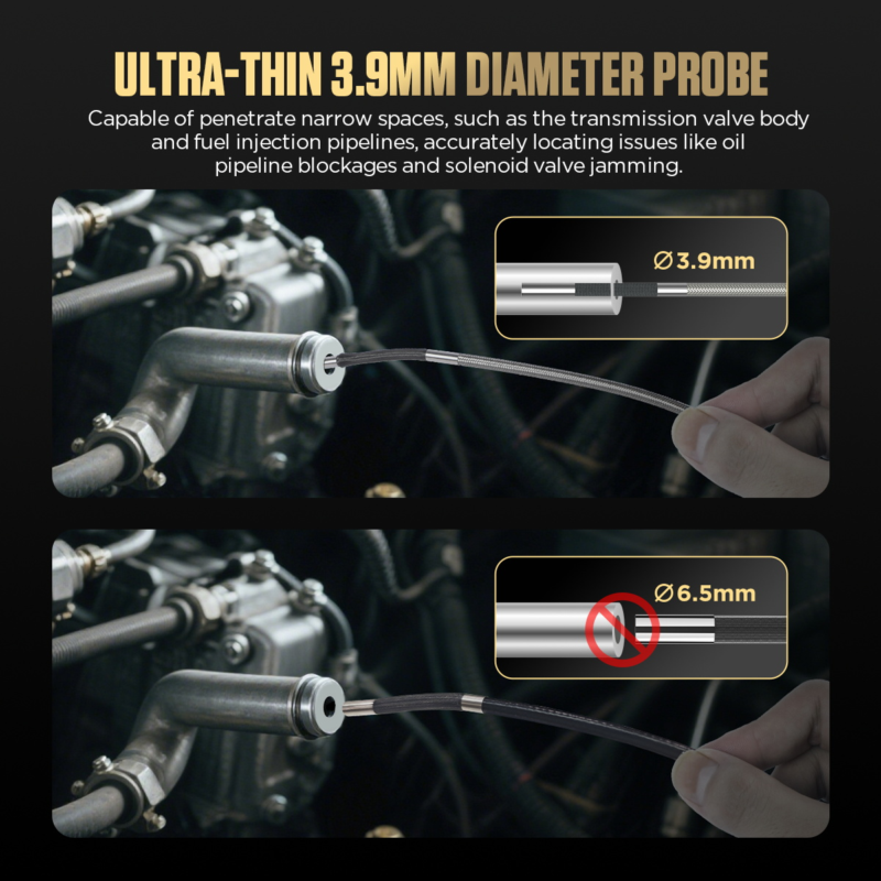 - Ultra-Thin 3.9 mm Inspection Camera with 8× Zoom: Easily reach tight spaces like transmission valve bodies and fuel injection pipelines.