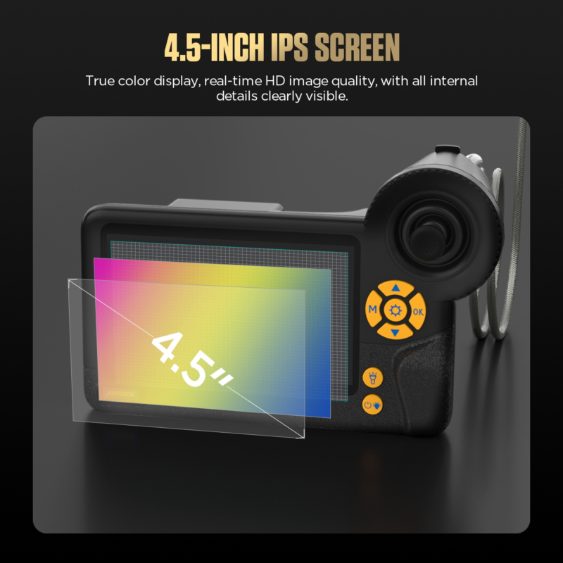 This snake camera is equipped with a 360° full-range rotation function in four directions, offering flexible and comprehensive inspection views. The unique high-temperature alarm system ensures safe and reliable operation. Its slim probe easily navigates complex spaces and supports up to 8x digital zoom, allowing for precise detail capture. The 4.5-inch IPS HD screen displays real-time, clear images, helping users complete various inspection tasks quickly and accurately.