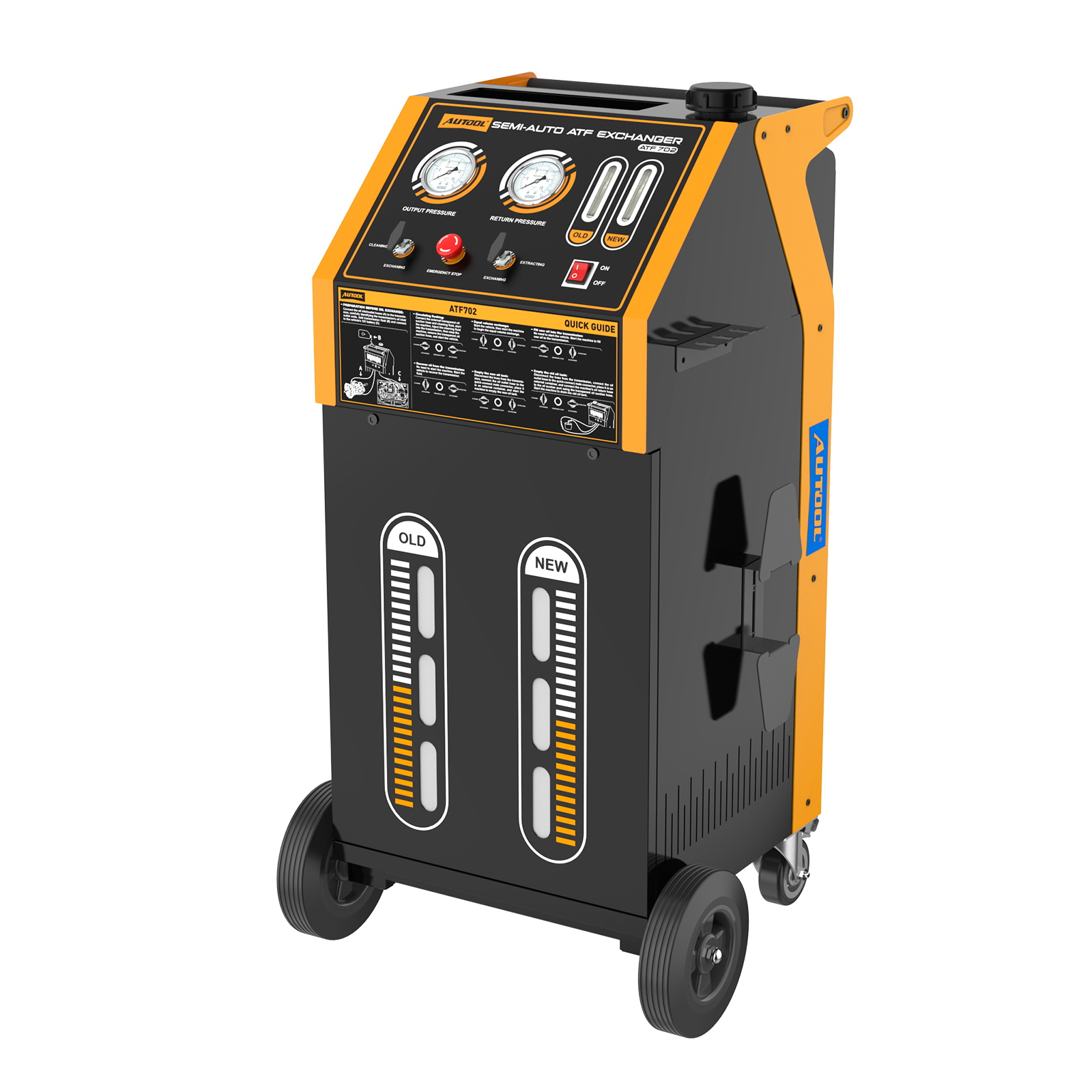 The AUTOOL Transmission Fluid Changer features an intelligent control system for automatic transmission fluid replacement. During operation, the device connects to the transmission fluid lines via a dedicated interface, automatically identifying fluid flow direction. Its integrated pump and sensors work in tandem to monitor fluid flow rate and replacement ratio in real time. Throughout the process, old fluid is automatically extracted while new fluid is precisely injected in equal quantities, ensuring complete and uniform fluid replacement.