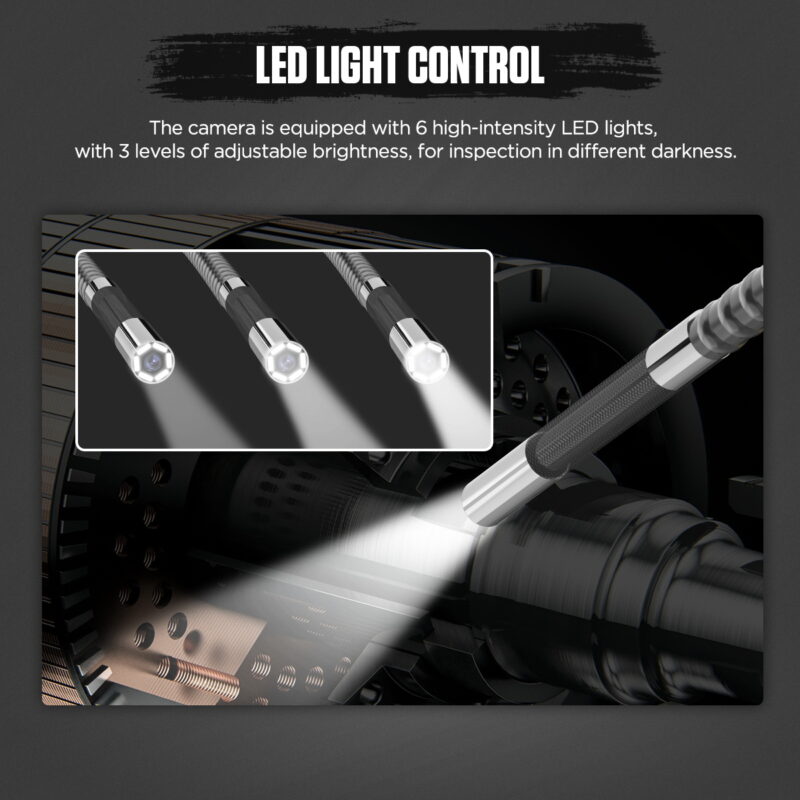 - LED Light Control: The camera features 6 high-intensity LED lights with 3 levels of adjustable brightness, allowing for inspection in various lighting conditions.