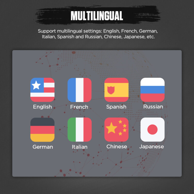- Multi-Lingual: Support multilingual settings: English, French, German, Italian, Spanish Russian, Chinese, Japanese, etc.