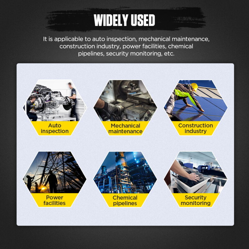- Widely Used: It applies to auto inspection, mechanical maintenance—the construction industry, power facilities, chemical pipelines, security monitoring, etc.