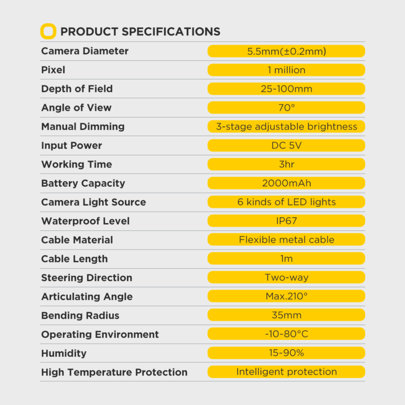 - IP67 Waterproof: The waterproof grade of the camera is IP67, with waterproof and oil-resistant performance, which can work in wet pipes.