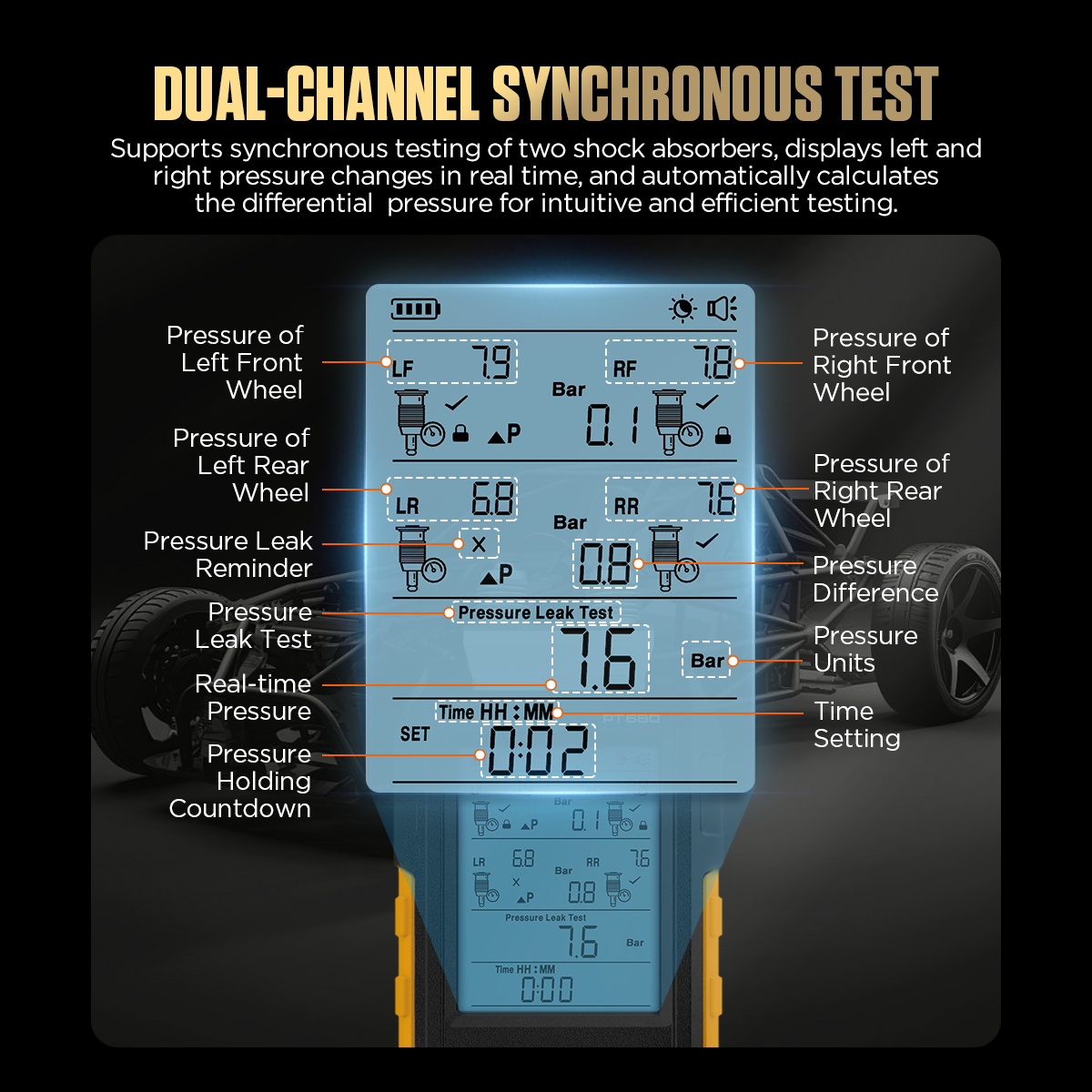 • Dual-Channel Synchronous Testing: Tests two shock absorbers at the same time. Displays real-time left and right pressure changes.