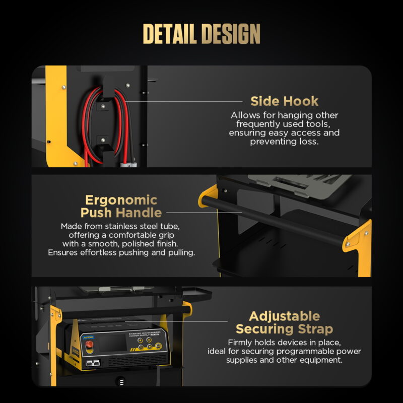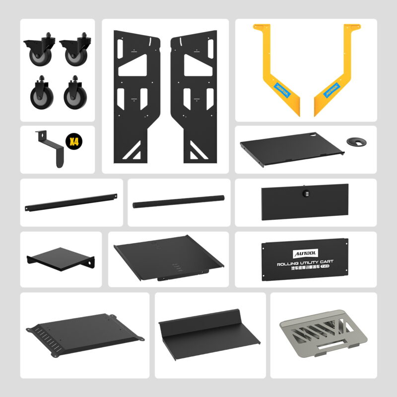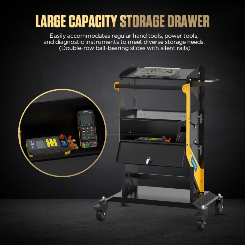 The trolley features a high-strength aluminum alloy frame, offering a solid structure to support diagnostic tools and equipment. It is designed to improve work efficiency, protect tools, facilitate movement and storage, adapt to various work environments, and enhance safety and stability. This trolley provides great convenience for automotive diagnosis and repair, making it an essential tool for automotive professionals.