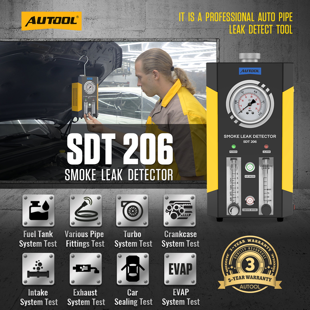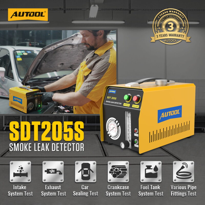The AUTOOL smoke leak detector series includes SDT101 and SDT103 for EVAP systems (3.2Kpa), SDT106 and SDT202 for beginners (12 psi), and SDT203, SDT205, SDT205S, SDT206, and SDTMASTER as standard and high-end models (15 psi).SDT208 supports up to 35Psi.