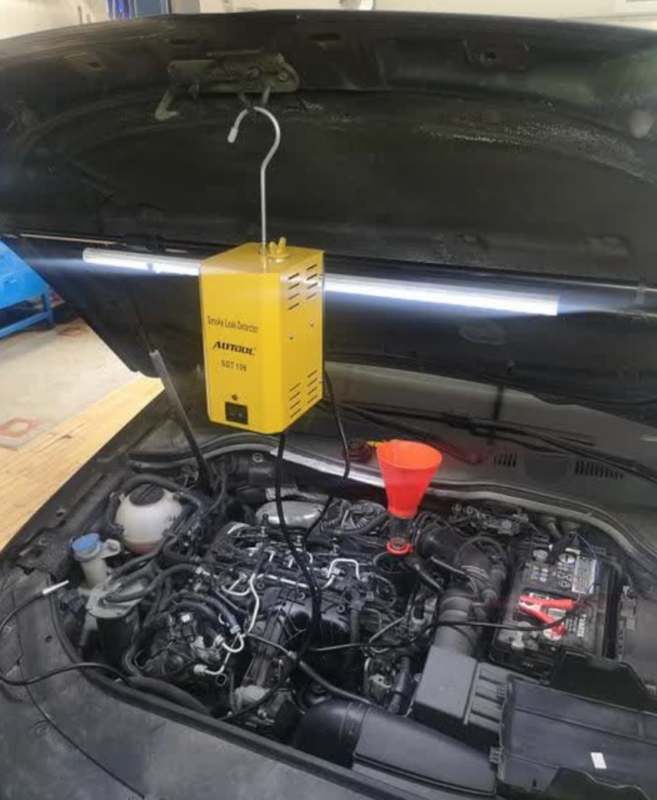 Add 20 ml of smoke oil, connected to the battery power, immediately out of the smoke, the airbag can be connected to the air intake hose, and then the smoke conduit is connected, the smoke quickly from the location where there is a leak out, very convenient.